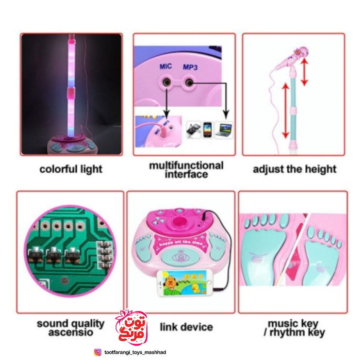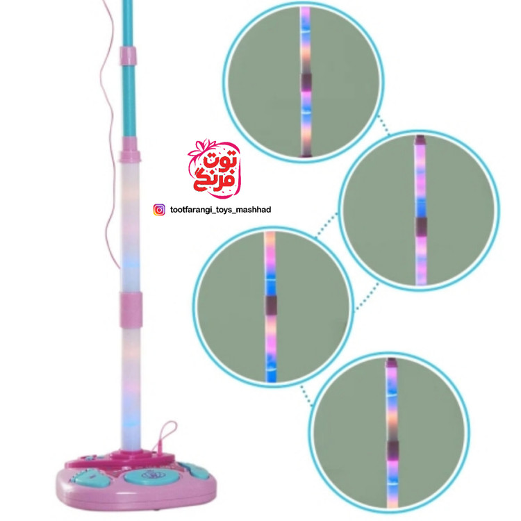 این میکروفون اسباب بازی طراحی بسیار جذاب و رنگ کودک پسندی دارد که توجه تمام کودکان را به خود جلب خواهد کرد. همچنین این اسباب بازی قابلیت تنظیم ارتفاع را دارا است و کودک شما می تواند آن را متناسب با قد خود تنظیم کند. این اسباب بازی قابلیت پخش نور و نورپردازی را دارا است و به وسیله باتری کار می کند.