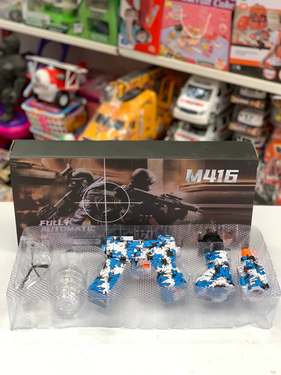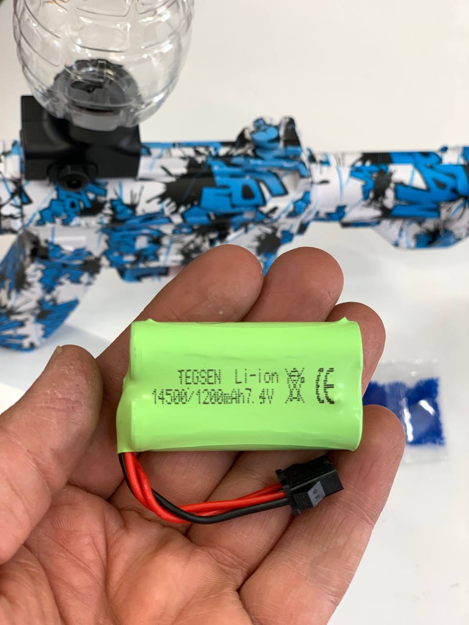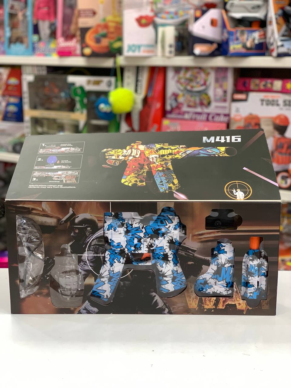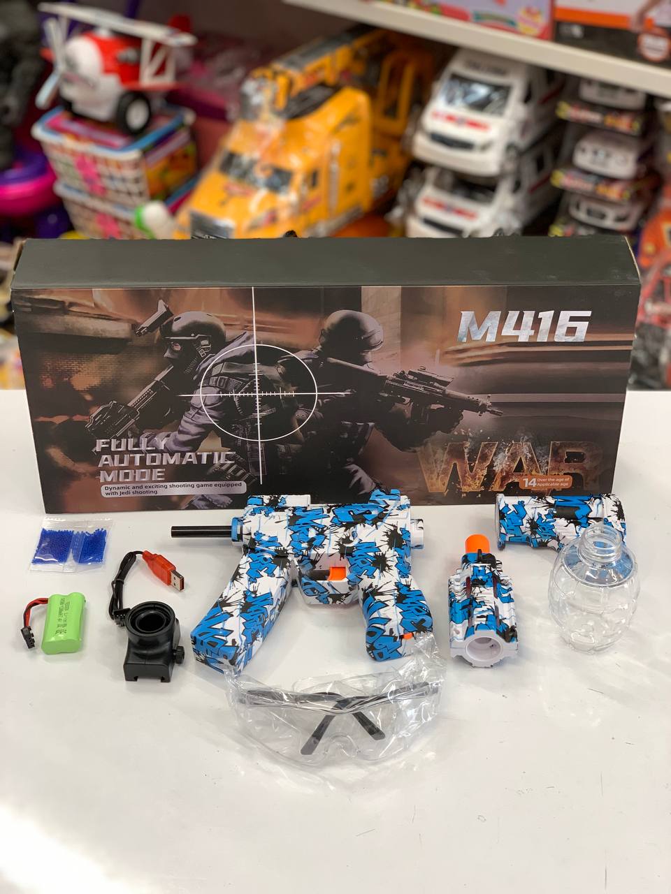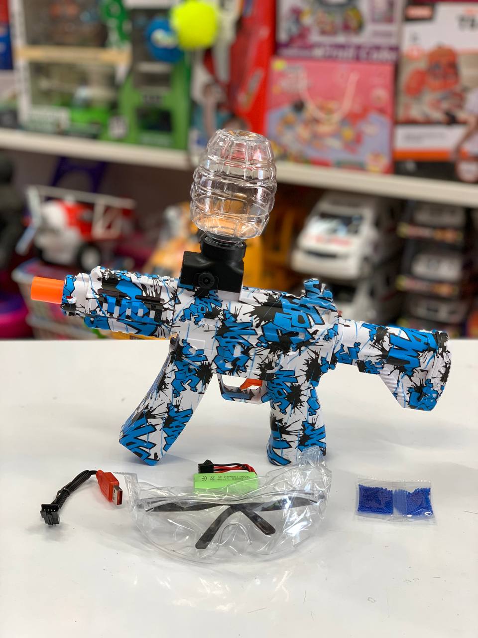 اسلحه ، عینک محافظ ، کابل شارژ ، باطری شارژی ، تیرژله ای ، مخزن تیر