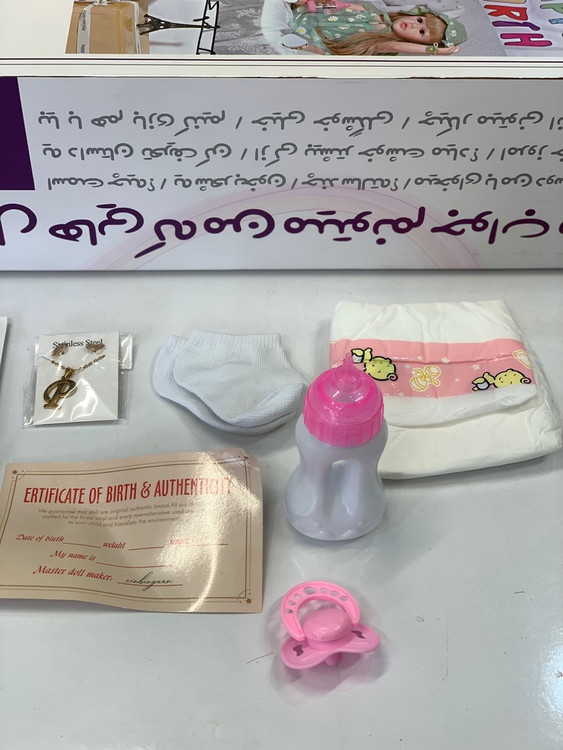 عروسک , پستونک ، دفترچه ، شناسنامه ، پوشک ، شیشه شیر ، پلاک و زنجیر گردنی ، جوراب
