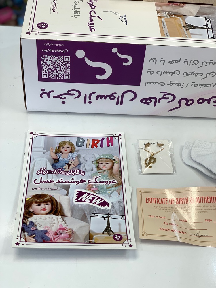 عروسک , پستونک ، دفترچه ، شناسنامه ، پوشک ، شیشه شیر ، پلاک و زنجیر گردنی ، جوراب