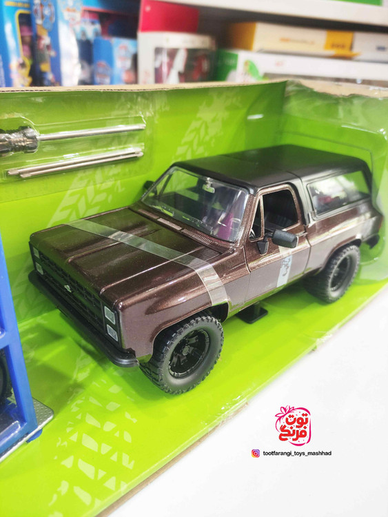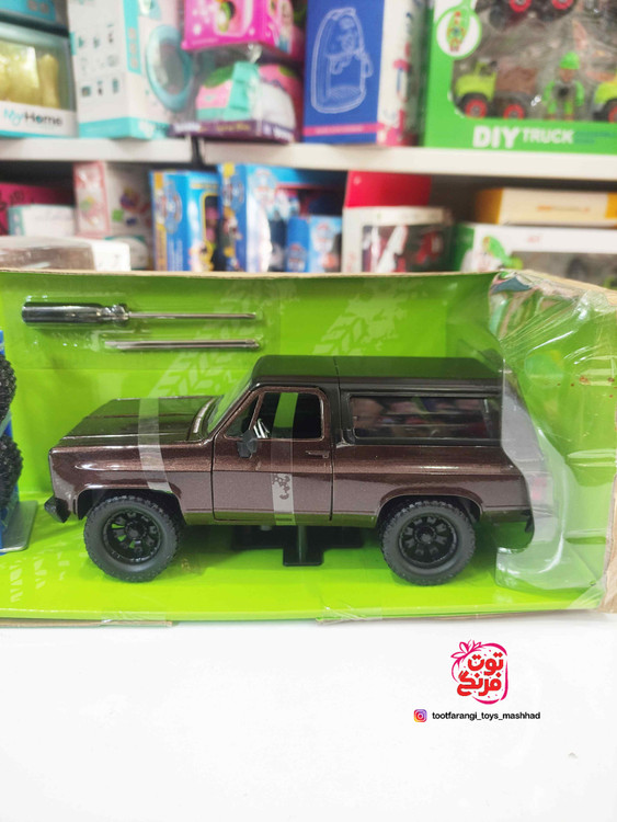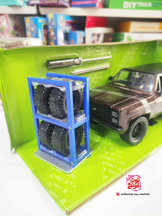 ماکت ماشین ، استند لاستیک ، ۴ حلقه رینگ و لاستیک اضافی ، پیچ گوشتی ، ۲عدد میله چرخ